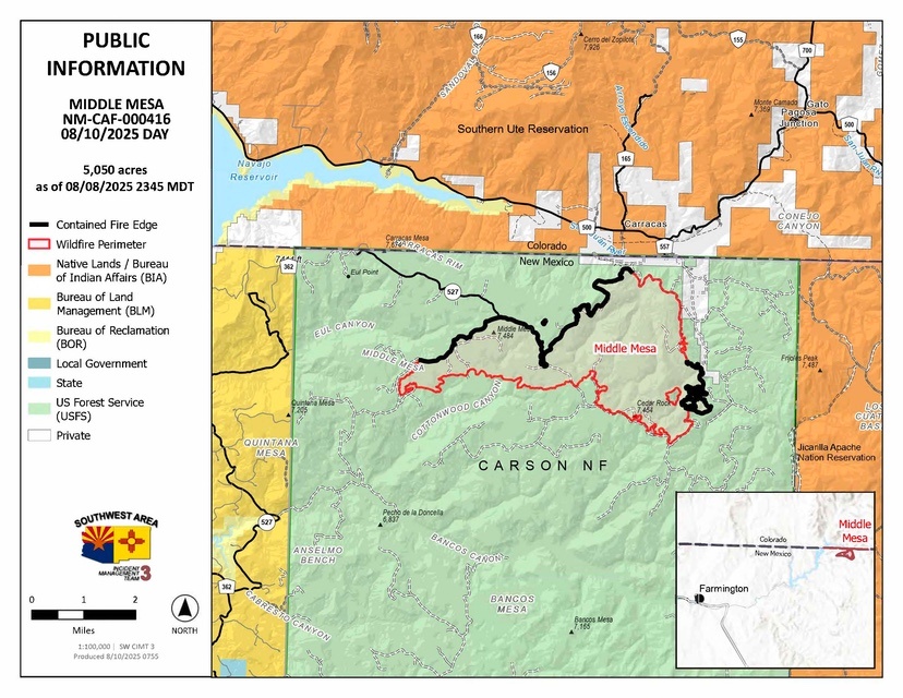 The Middle Mesa Fire is burning in New Mexico, just south of the Southern Ute Indian Reservation, and east of Navajo Reservoir.