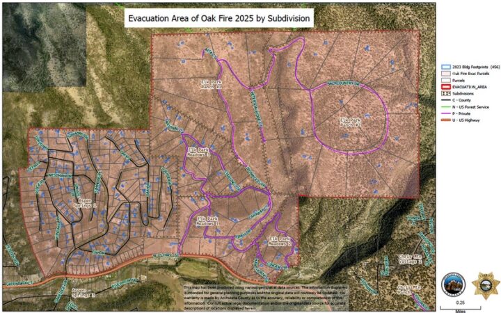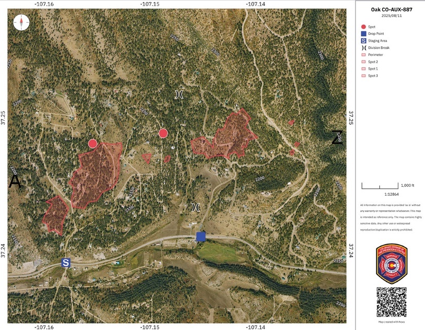 By the end of Day Two, the Oak Fire west of Pagosa Springs had been downgraded from 150 acres to 75 acres, and by evening on Monday August 11, the Archuleta County Sheriff’s Office was listing the fire as “14% contained”. Photos shared by the Sheriff’s Office on Monday showed very little active flames or smoke.
