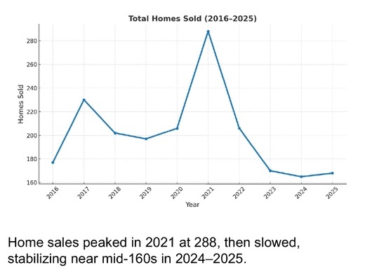 Over the past decade, the Pagosa Springs housing market has experienced significant growth, tempered by recent adjustments that suggest a period of stabilization. The number of homes sold reached a peak in 2021, reflecting strong pandemic-era demand, before settling into a steady range in the mid-160s during 2024 and 2025. This consistency in transaction volume indicates that demand has normalized to sustainable levels, aligning more closely with long-term averages.