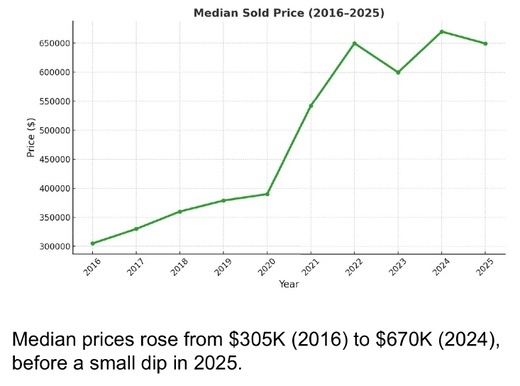 Median home prices tell the clearest story of growth and recent moderation. In 2016, the median was just $305,000; by 2024, it had more than doubled to $670,000. However, 2025 has brought a modest dip, suggesting affordability constraints and buyer caution are tempering further price escalation. Even with this adjustment, home values remain significantly above historic norms, pointing to lasting appreciation for property owners. This positive for owners is a negative for first-time homebuyers struggling to qualify for financing.