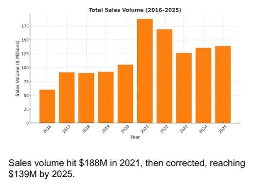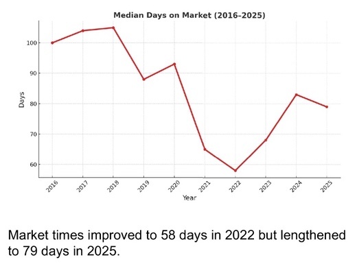 Total dollar volume followed a similar trajectory. Sales climbed to an impressive $188 million in 2021 before easing and stabilizing near $139 million in 2025. This contraction reflects both fewer ultra-high-end sales and the slowing pace of price increases. Meanwhile, average days on market, which dropped to a low of 58 in 2022 amid peak demand, have risen back to 79 by 2025. This reversion signals a return to more balanced conditions between buyers and sellers.