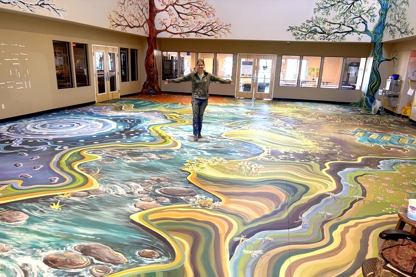 Photo: Muralist Jill Fives, who is responsible for many set designs with the Pagosa Springs Center for the Arts, stands in the lobby of Pagosa Peak Open School. She spent the summer recreating the space with a four-season mural.