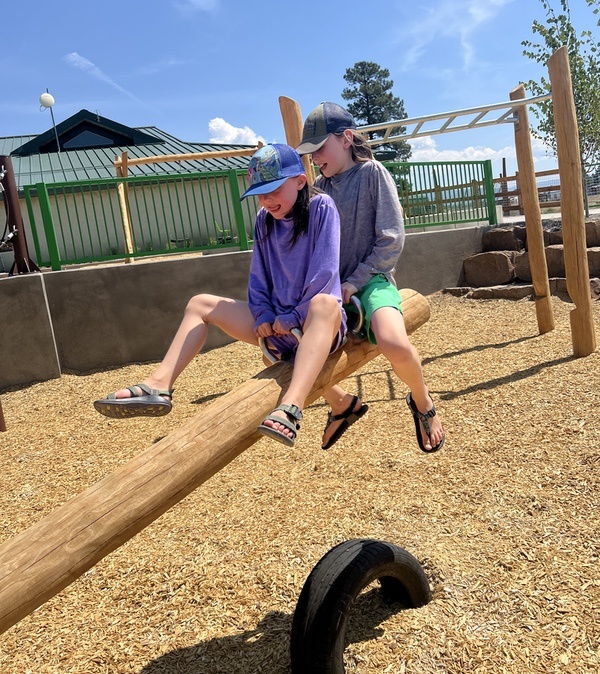 Westin and Avery try out the new teeter-totter on the Pagosa Peak Open School’s new playground.