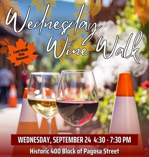 The final ‘Wednesday Wine Walk’ of 2025 is almost here, happening Wednesday, September 24 from 4:30–7:30pm on the Historic 400 block of Pagosa Street. Rain or shine.