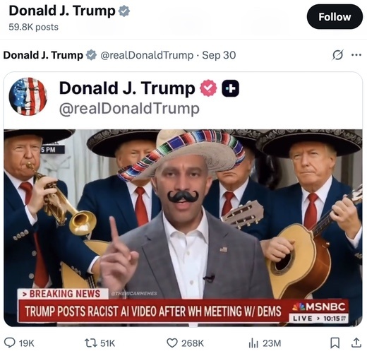 House Speaker Mike Johnson said so himself, on Friday, that of course President Trump is posting outrageously funny (if mildly racist) videos on his social media accounts, of Democratic Congressional leader Hakeem Jeffries wearing a mustache and a sombrero.
