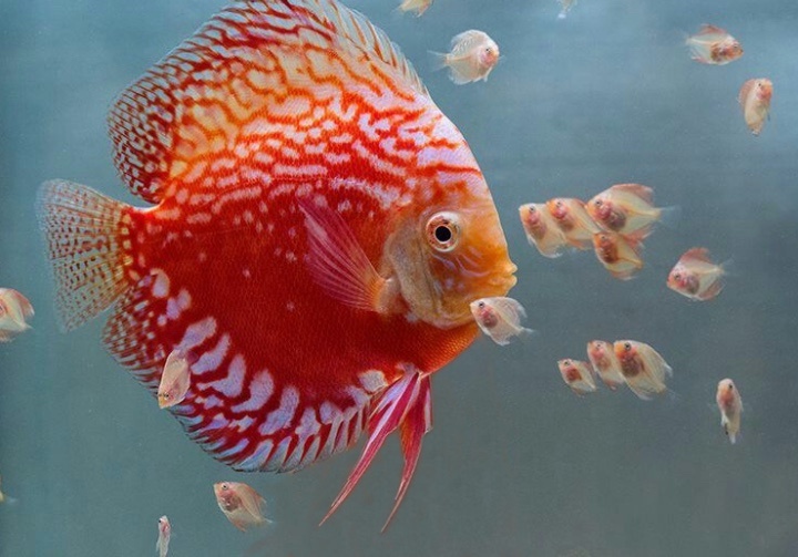 Here’s a photo of a ‘discus fish’ with her babies. Notice the blank expression on the mother’s face. This is a normal reaction to having 19 children all born at the same time.
