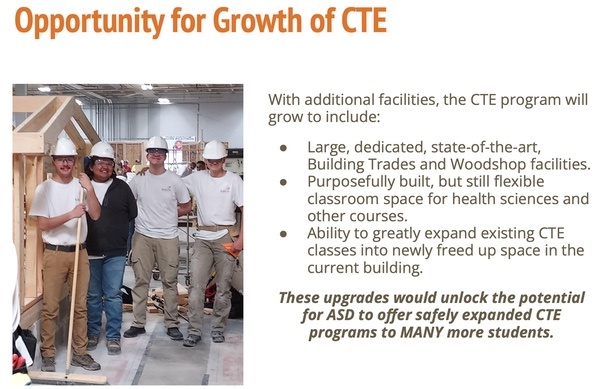Mr. Ridlehoover shared a number of PowerPoint slides, giving an overview of the ongoing cooperation between ASD and Build Pagosa to create a popular Careers and Technical Education (CTE) curriculum at Pagosa Springs High School, which is currently unable to meet student demand for training classes, with waiting lists as the result.