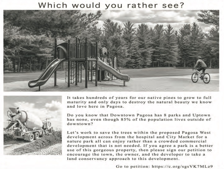 The SUN advertisement ends with an invitation to sign a petition at https://c.org/sgsVK7MLz9.  The headline on the petition page asks, “Doesn’t Uptown Pagosa deserve a nature park?”