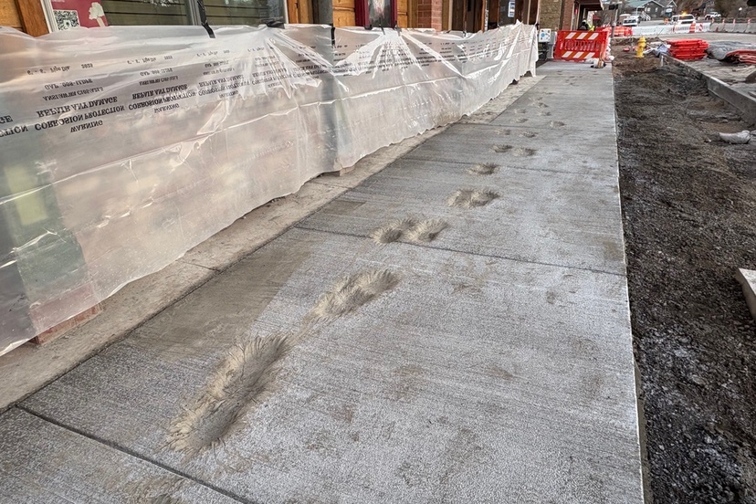 Photo: Footprints impressed into quick-drying cement by vandals, in downtown Pagosa during the CDOT reconstruction of Highway 160, November 2025.