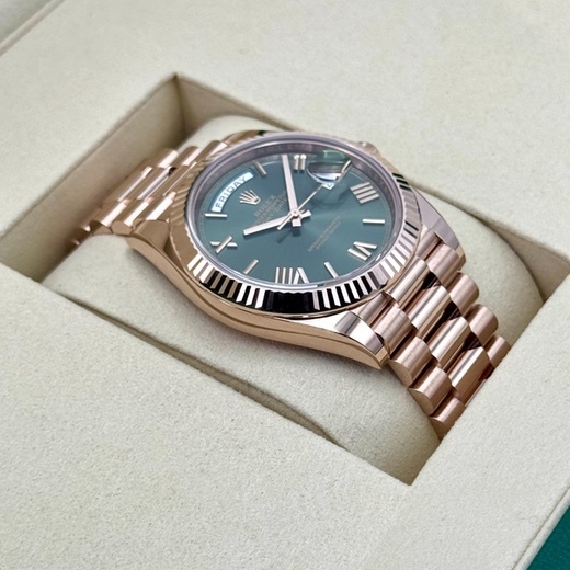 For example, you can buy a 2025 Presidential Rose Gold Rolex (Day-Date, 40mm) with an Olive Dial for $57,000.