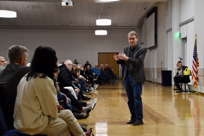 Photo: U.S. Sen. Michael Bennet answers a question from a constituent during a town hall at the University of Northern Colorado in Greeley on March 18, 2025. (Chase Woodruff/Colorado Newsline)