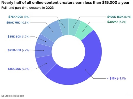 The article included this graph, based on NeoReach data, which suggests that half of all “content creators” (AKA influencers) earn less than $15,000 a year.