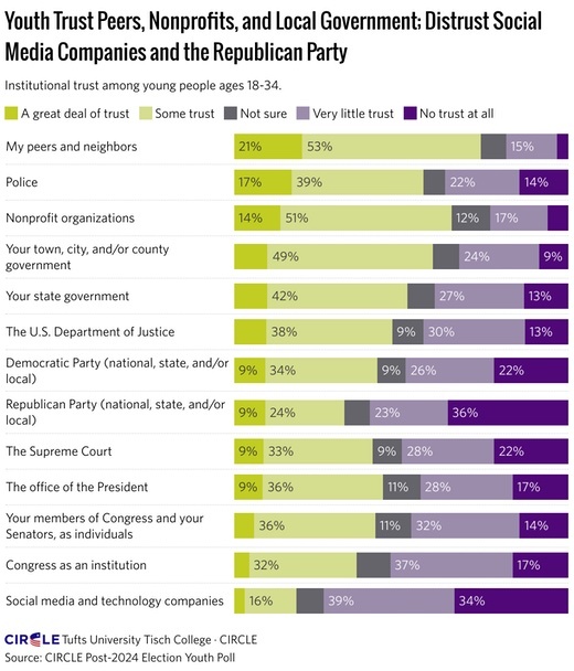 But according to Tisch College, “social media” is the least trusted source of information among young adults. Worse than Republicans.
