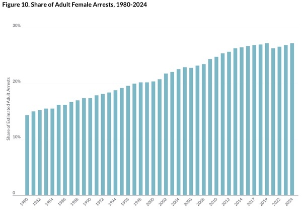 With male arrests falling more steeply over time, females now account for a larger share of arrests than four decades ago. Adult women’s share rose from 14% in 1980 to about 27% since 2020, and girls’ share of juvenile arrests increased from 18% to about 31%.