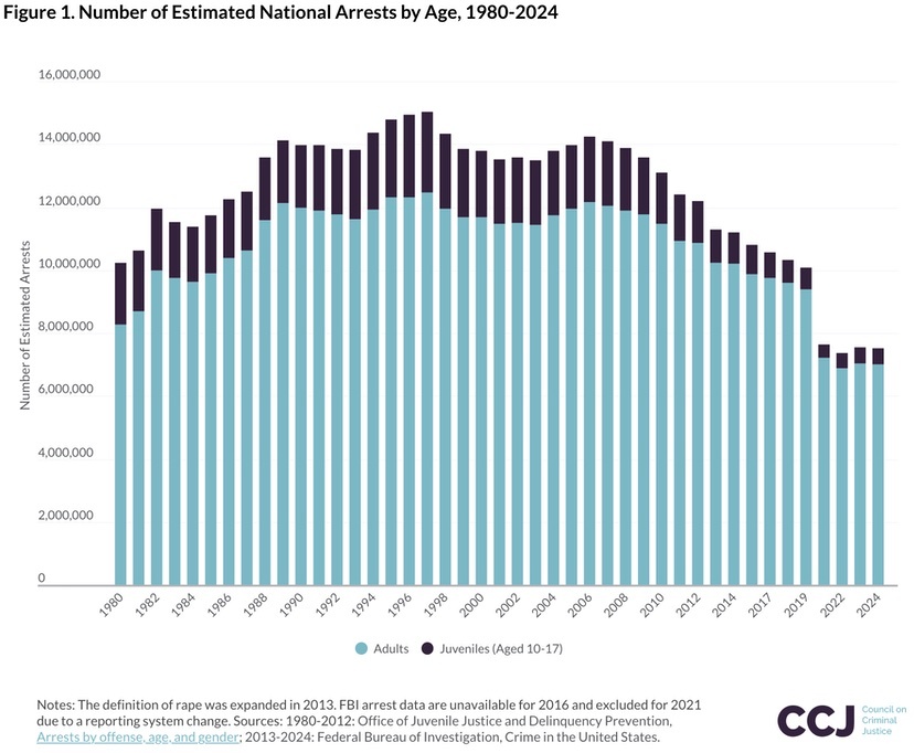 The brief — which is available here — restores that visibility. By combining historical federal estimates with recent FBI data, it rebuilds national arrest rates from 1980 through 2024 to provide a clear, comparable picture of how arrests have changed across demographic groups and offense categories. For the first time since federal reporting ended in 2020, decision makers can again monitor national arrest trends using a consistent, historically anchored dataset.