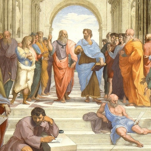 In the center of the painting, pointing at the sky, is Plato, and the guy to his right is Aristotle, and they’re walking through a Roman mall where where numerous famous philosophers and teachers are philosophizing and teaching. Plato and Aristotle were, however, Greeks, and presumably never had an opportunity to walk through a Roman mall.