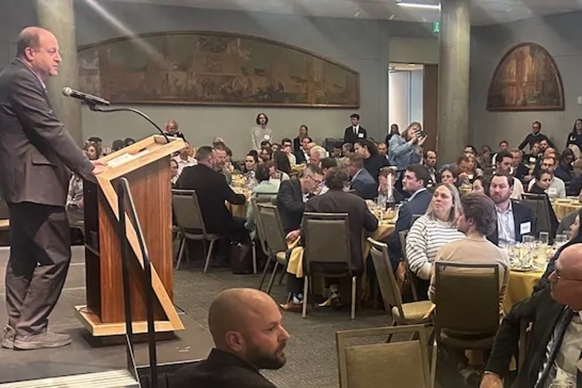 Photo: Governor Jared Polis at a Colorado Solar and Storage Association event at History Colorado, November 2025.