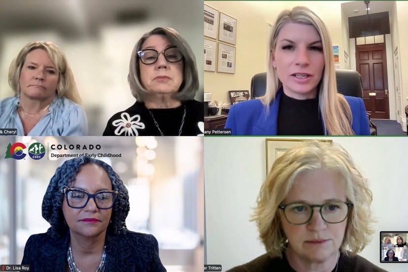 Photo: U.S. Rep. Brittany Pettersen, top right, during a virtual press call, talks about how the Trump administration’s move to freeze federal child care funds will affect parents and families in Colorado. (Screenshot from Zoom)