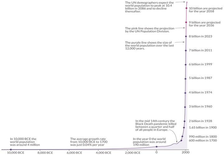 I came across a graph the other day, on the website OurWorldInData.com, showing the population explosion since about 1700. The blue line is the estimated populations up until 2023, and the pink line shows estimates about the future by the UN Population Division. They predicted a peak global population of about 10.4 billion, with a declining population after 2086.