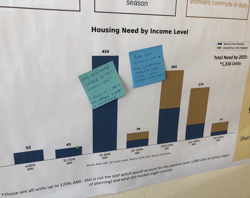 Another of the posters showed some data from last year’s Housing Needs Assessment, as a bar graph. The consultants last year estimated that we will need 1,300 new housing units over the next few years, with the majority of those units aimed at low-wage workers (434 units) and middle-wage workers. (76 units plus 364 units).