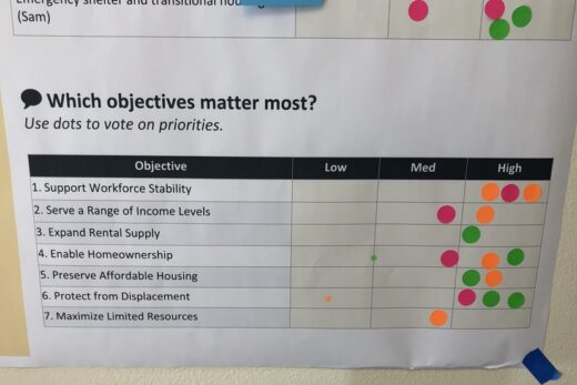As is typical at these types of community meetings, participants were invited to place stickers and sticky notes on large printed posters, to indicate their preferences, questions and ideas. One of the posters asked which specific housing issues the participants want to see prioritized.