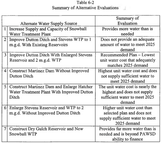 We might also note one unsuitable project that was “beyond PAWSD ability to finance”: a Dry Gulch Reservoir and replacement of the Snowball Treatment Plant.