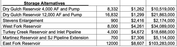His conclusion: Of the six reservoir sites, a 4,000 acre-foot Dry Gulch Reservoir and its necessary pump station was the most affordable alternative based on the “cost per acre foot” of storage. The primary location for this future reservoir site was a 660-acre ranch north of downtown Pagosa Springs.