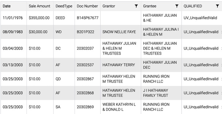 The same month that the new Harris report arrived — designating the Dry Gulch reservoir as a preferred reservoir site — a flurry of five real estate filings took place, concerning the ownership of the 660-acre “Dry Gulch” ranch, including a Quit Claim Deed issued to a limited liability company called “Running Iron Ranch LLC”.