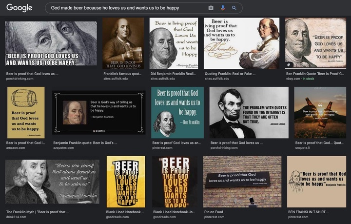 Dr. Franklin might have actually said this at some point — certainly, most of us have had the very same thought while working our way through a six pack — but according to the people who spend their lives chasing the authenticity of Internet quotes, there’s no actual record of him saying it.  Perfectly understandable that there’s no written record.  Who keeps a written record when they’re drinking beer?  Not me, that’s for sure.