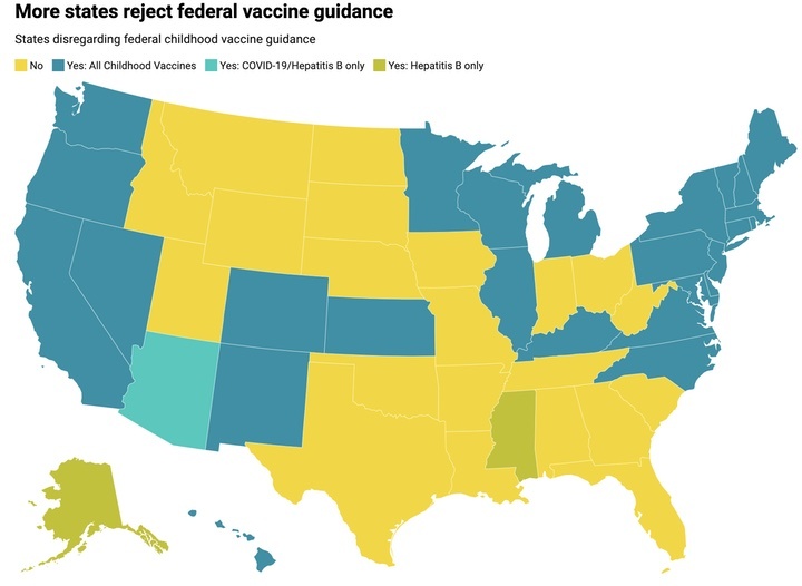 New state-by-state recommendations reflect a partisan divide, as all states with Democratic governors have rejected federal childhood vaccine guidance while many Republican states have not.