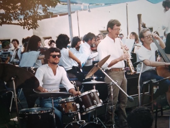The jazz ensemble, including Kirk Kadish on keys, Richard Snider on bass, Dave Anderson on Soprano sax, and myself on my little jazz set. We played the well-attended 4th of July concert in the courtyard of the Palace of the Governors. Featured was a jazz suite based on a piece by French composer, Gabriel Fauré. (What a thrill!)